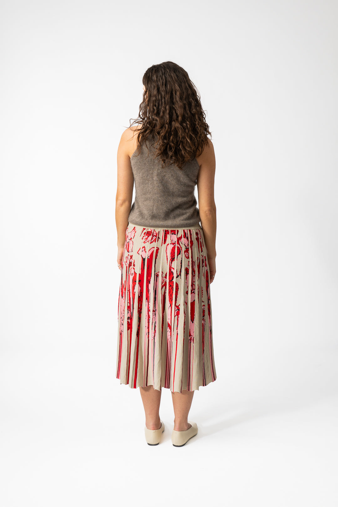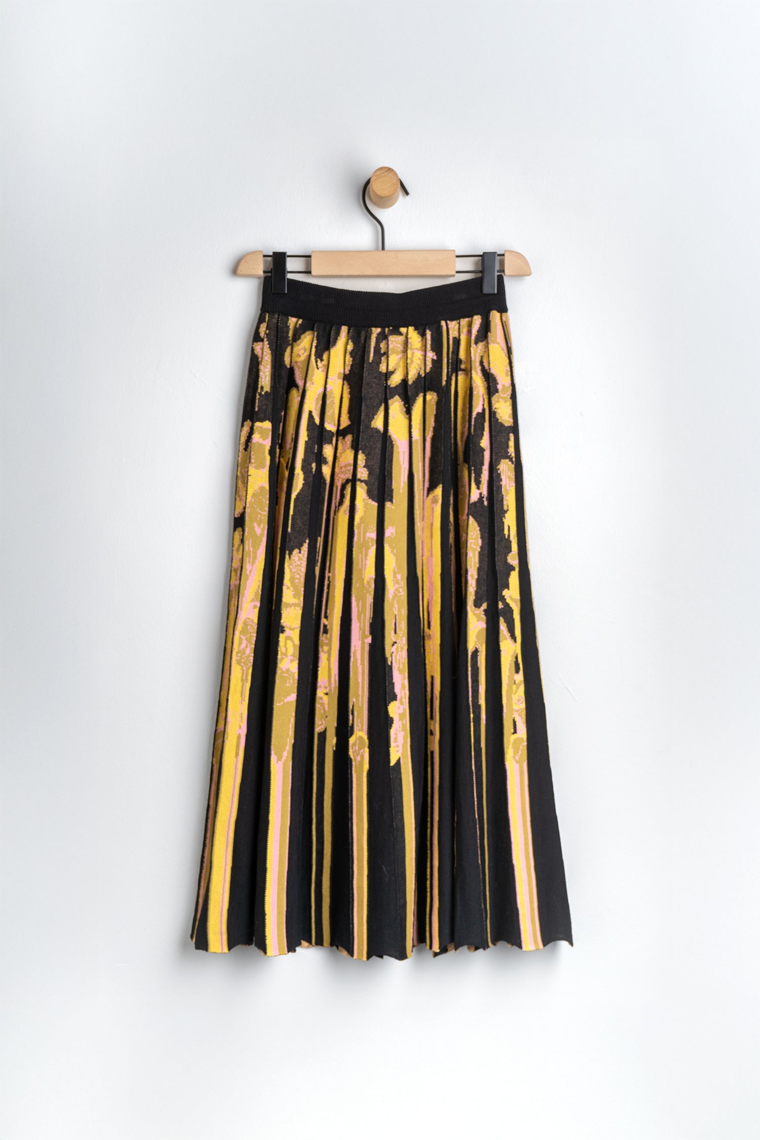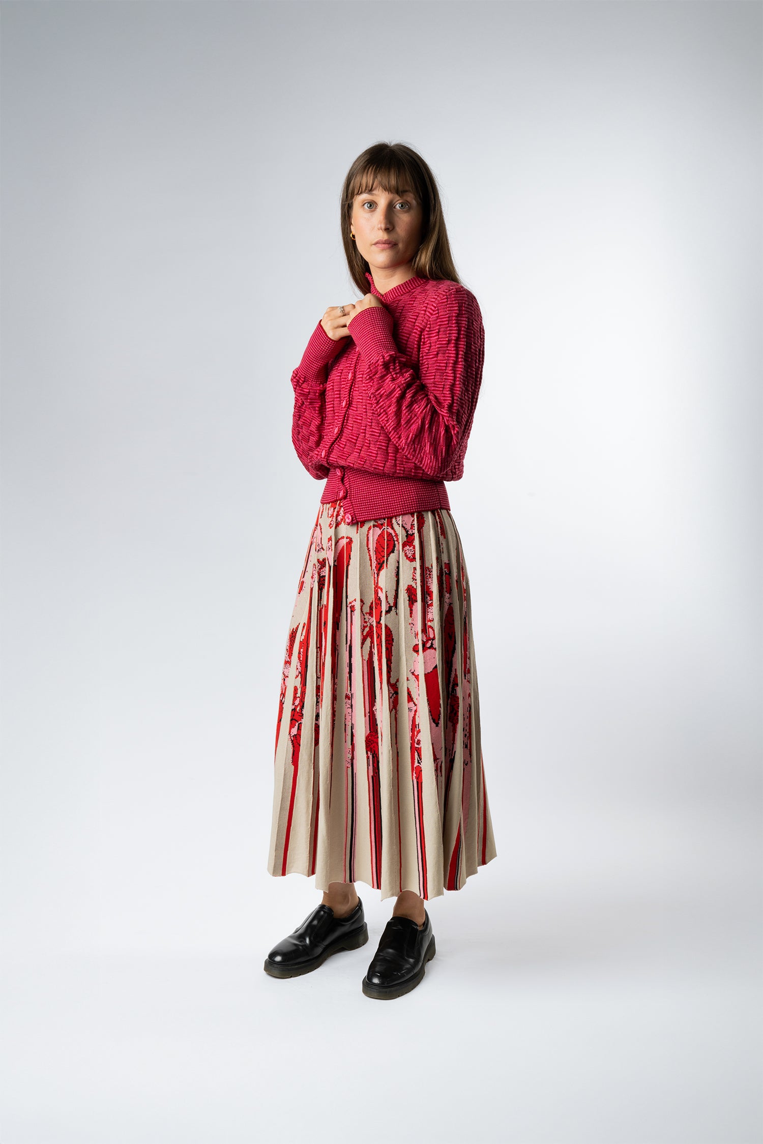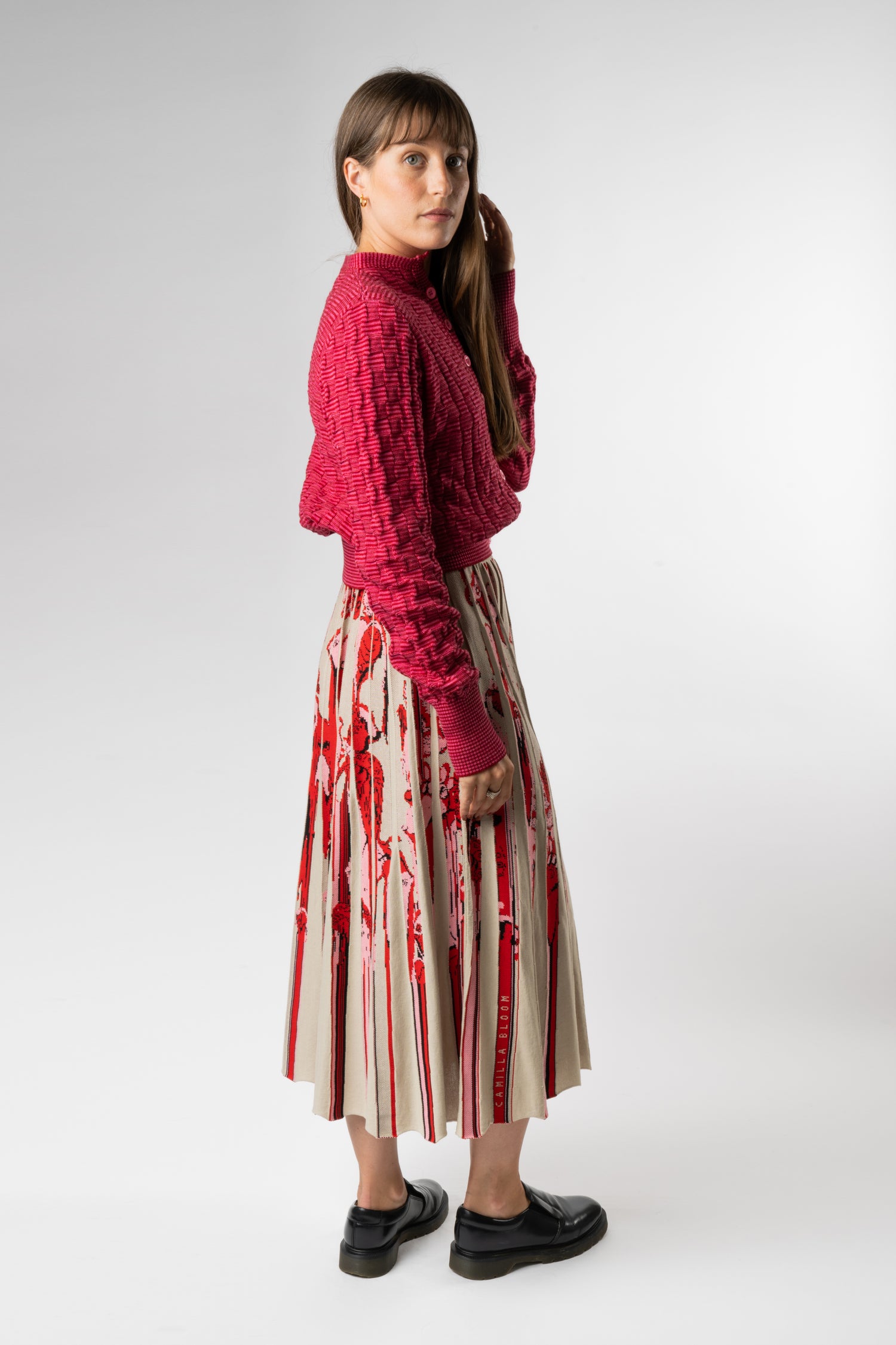 Comprising small pleats and Camilla’s hallmark distorted floral imagery, this midi skirt has the ability to elevate even the dullest of outfits using its vivid knit colourways and overall quirky warmth to win anyone over. With a subtle A-line silhouette and comfortable ribbed high waist, the Flowermelt is unapologetically bold and expressive, an ideal option for collectors of unique, artistic ready-to-wear.