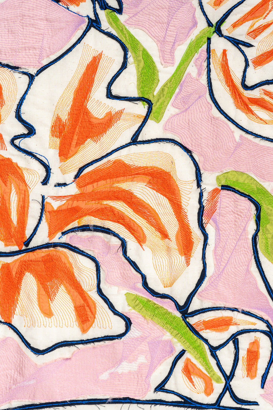 Fluid lines and florals inspire Ellie's work, which often feature still life scenes in varying states of realism and abstractedness. Utilising fabric offcuts to help inform the shape and composition of each work, and using stitching, embroidery and applique as her process, her practise is rooted in sustainability.