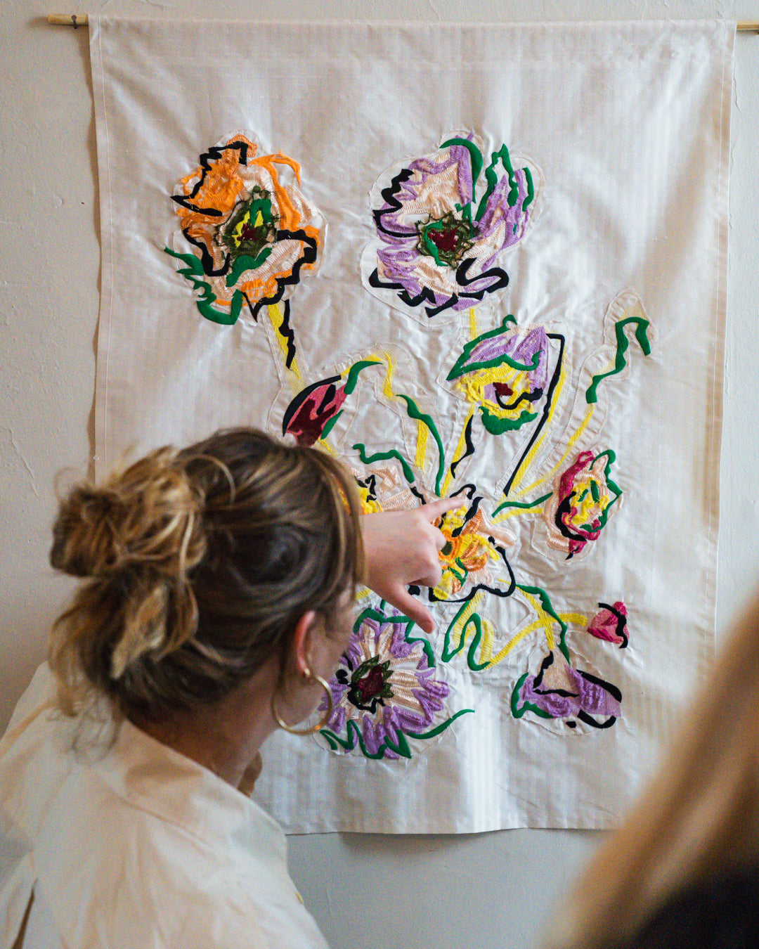 Utilising fabric offcuts to help inform the shape and composition of each work, and using stitching, embroidery and applique as her process, her practise is rooted in sustainability.