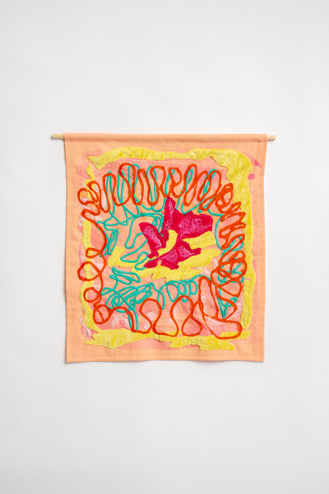 Utilising fabric offcuts to help inform the shape and composition of each work, and using stitching, embroidery and appliqué as her process, her practise is rooted in sustainability.