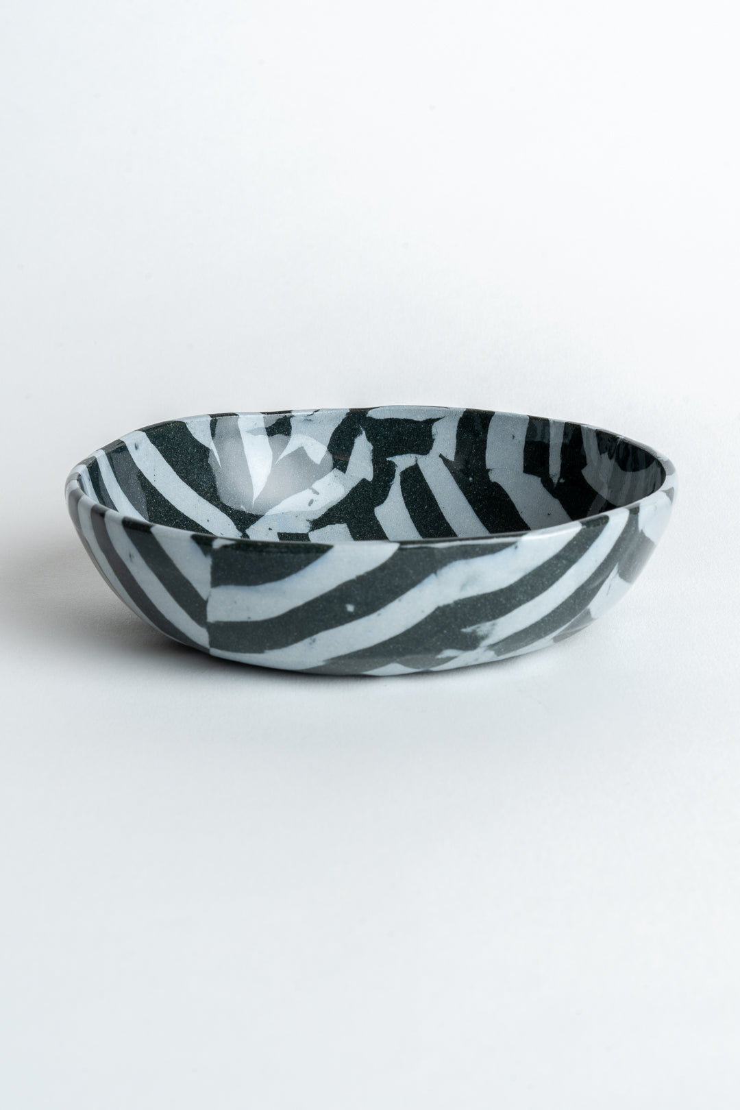 Made using a technique called 'nerikomi' - a process of stacking, cutting and rolling together pieces of clay to create patterns, the Checkerboard bowl is made by hand in South London. The bowl has a baby blue and charcoal grey stripe design with a gloss glaze finish.