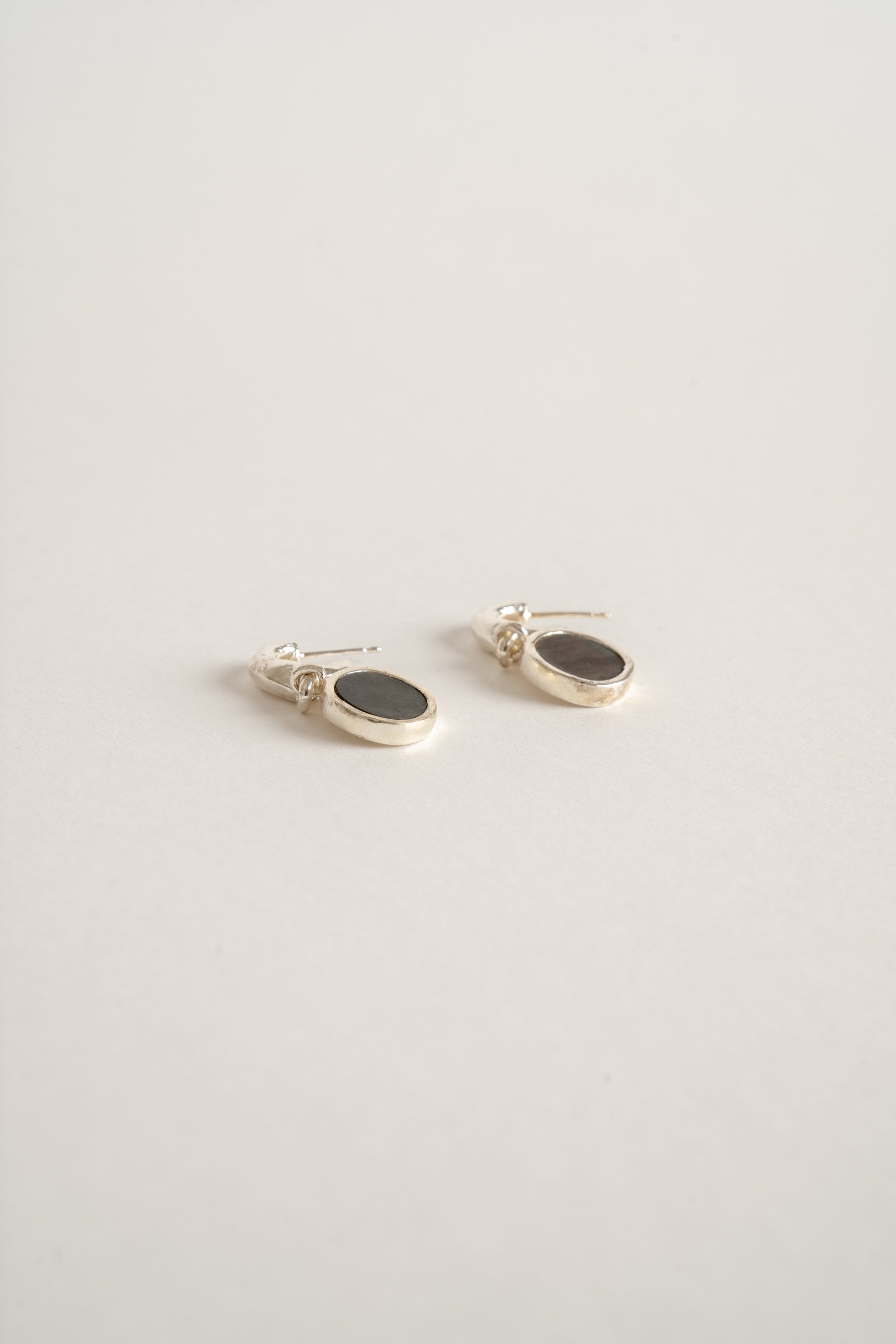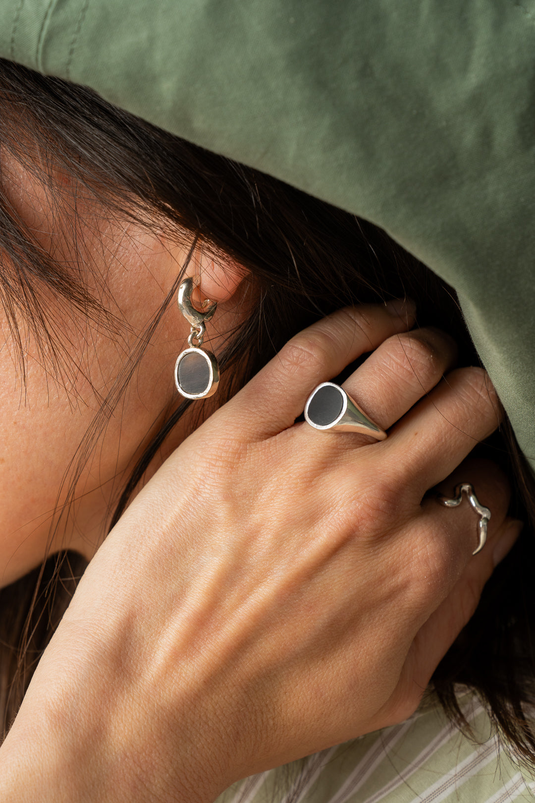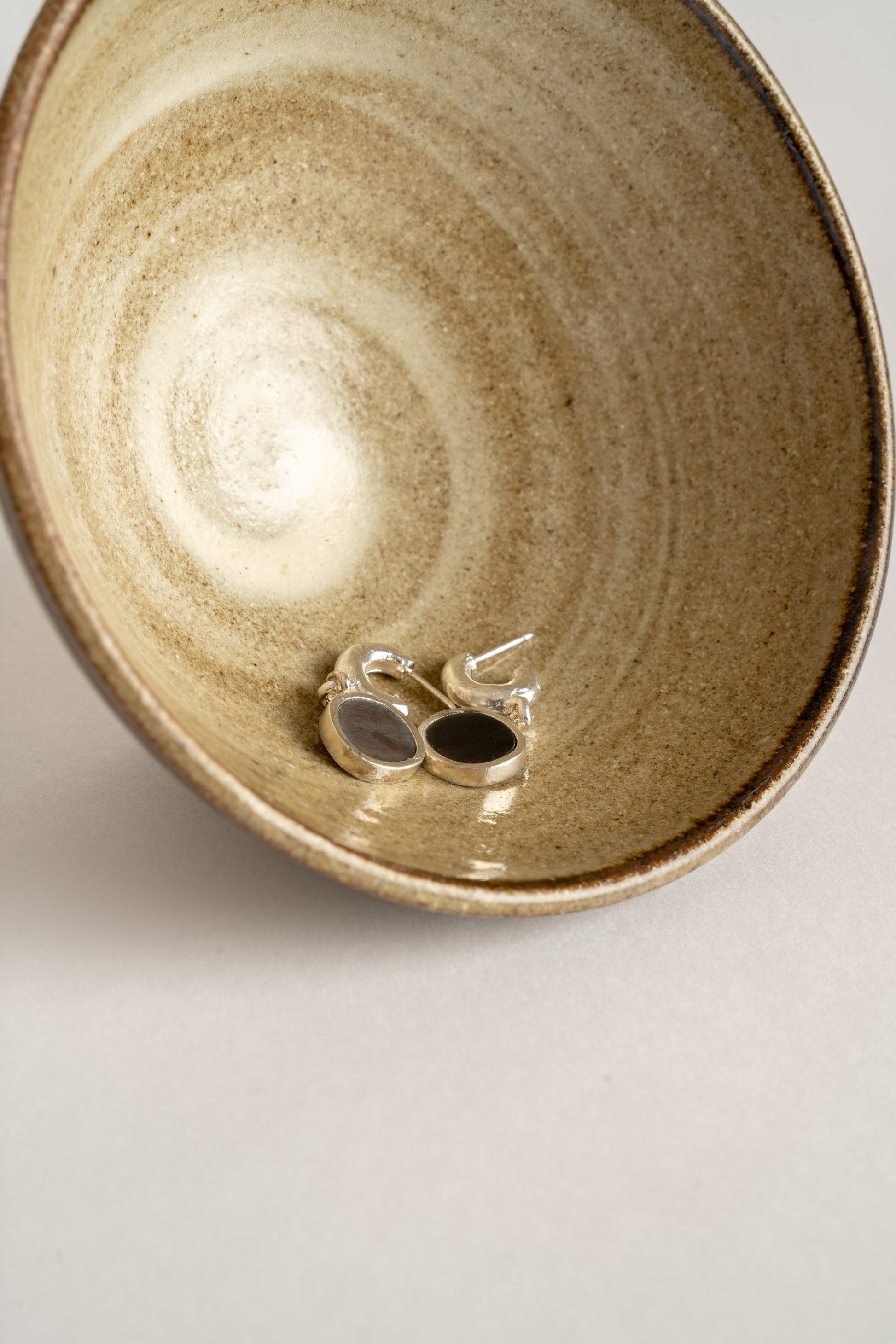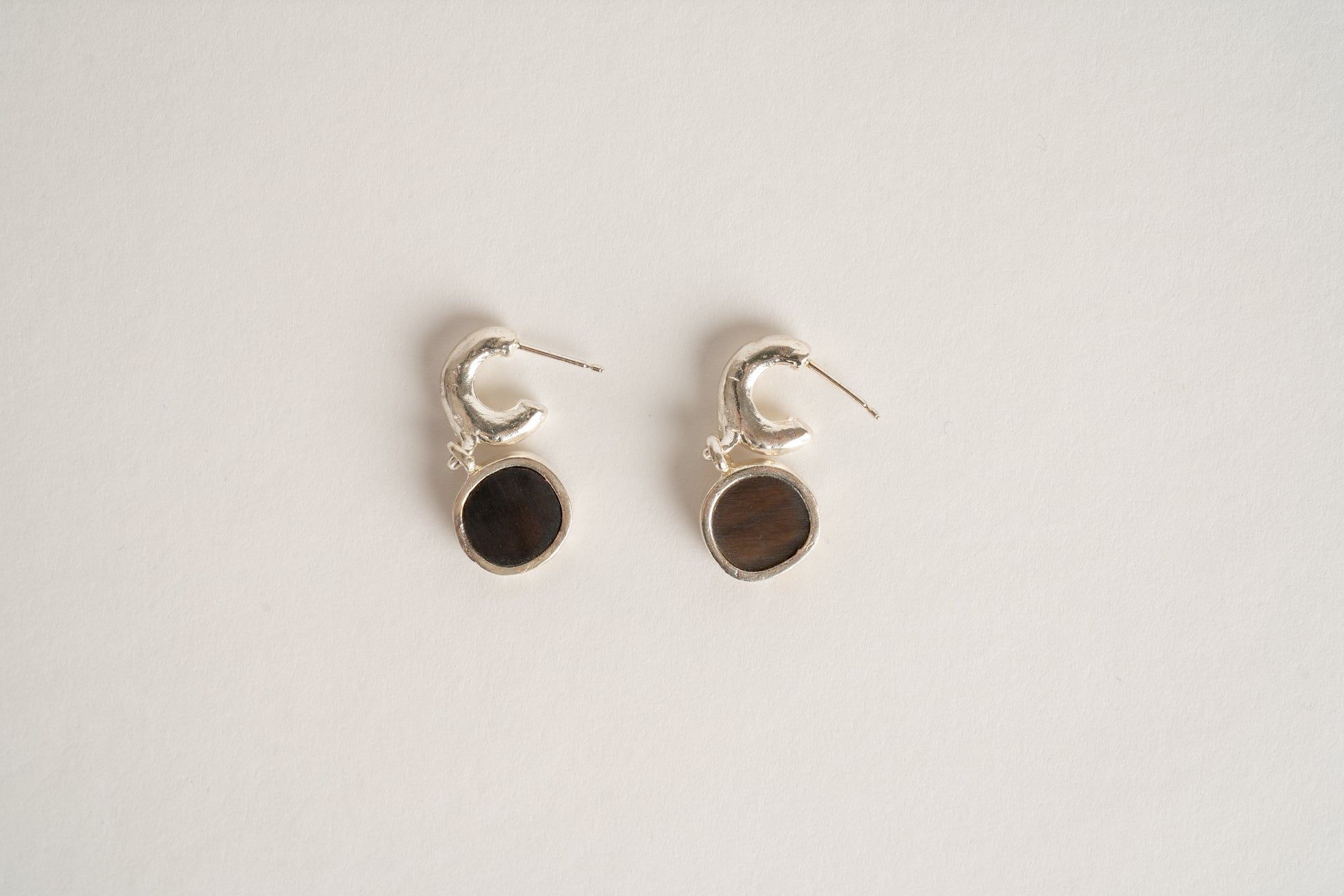 By celebrating the natural texture and colour of the horn - usually a waste product from farming - they have taken the material and laid it into a contemporary setting, their recycled silver earrings.
