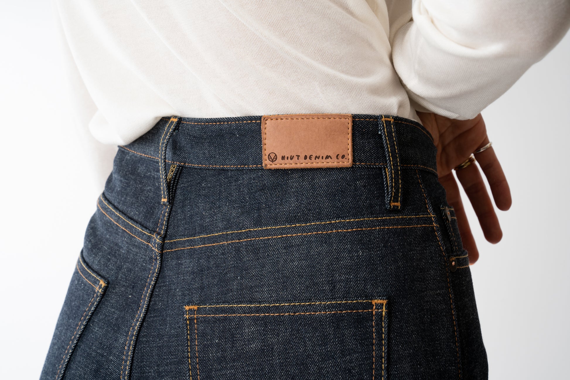 Each pair bears the Hiut Denim branded leather patch (the stamp of approval for Denim Heads), plus the signature red owl rivet on the left back pocket.