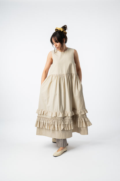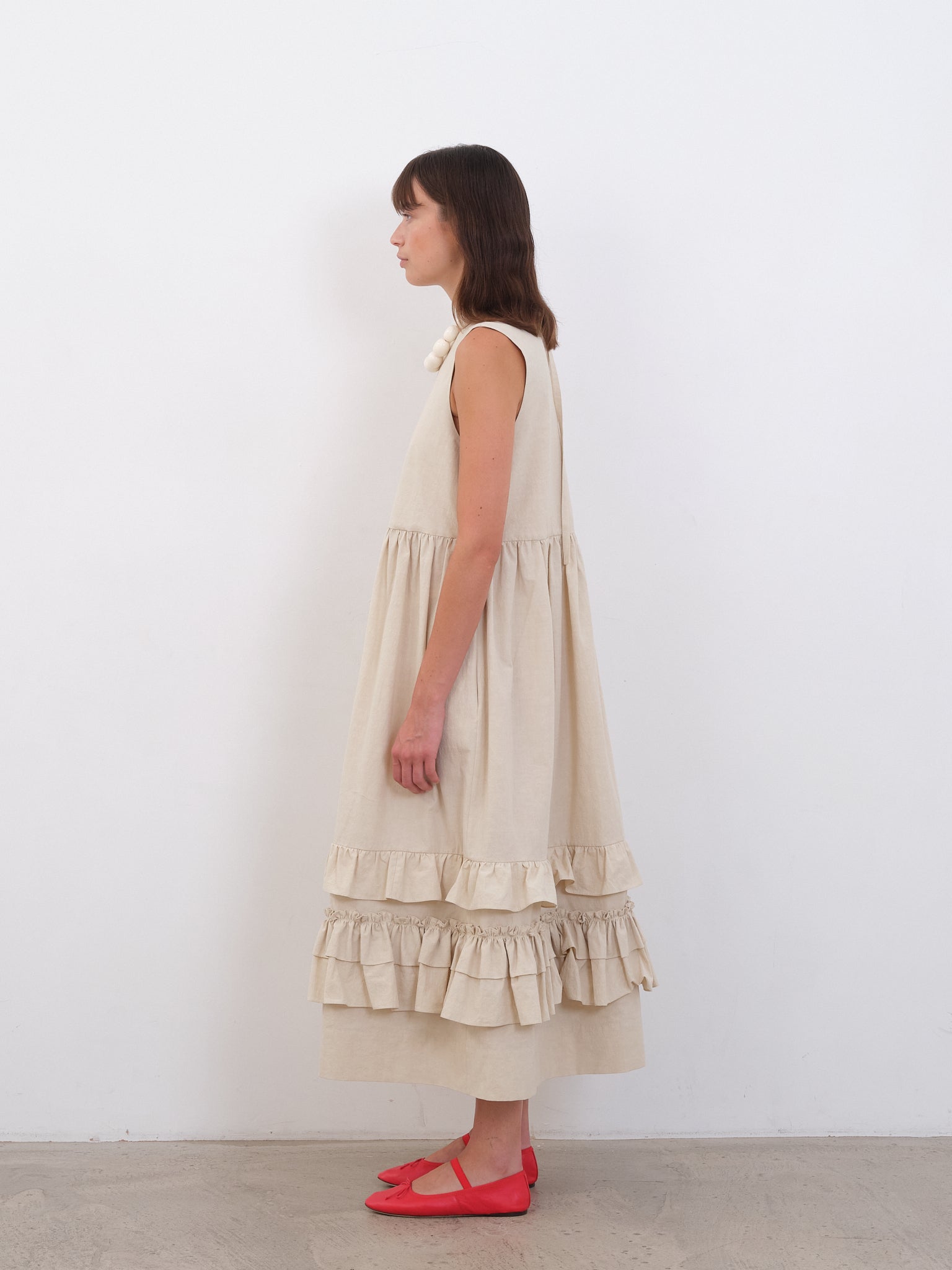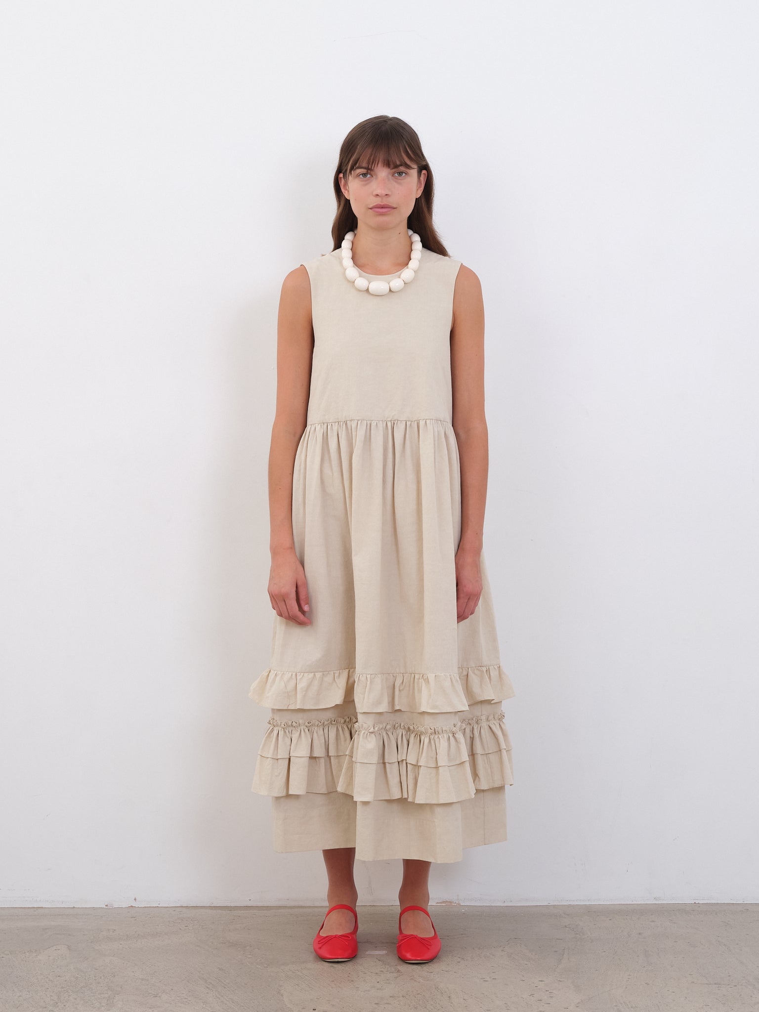 The Genevieve Dress is the perfect sleeveless, ankle length dress. A study in texture and movement, offering a soft yet structured feel. With sweet details including a tie neck fastening, frill hem, gathered waist and pockets.