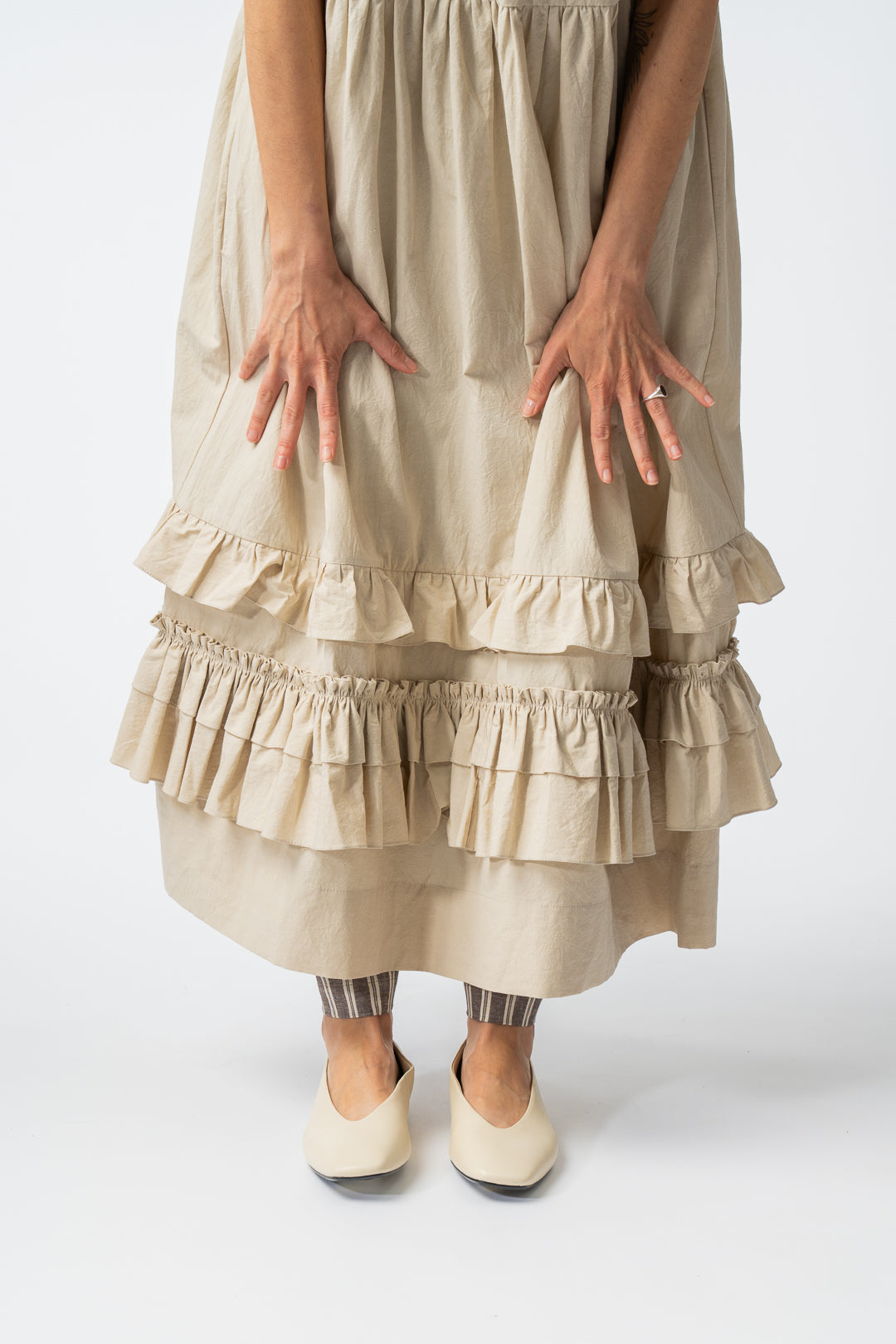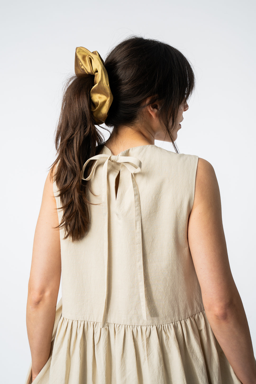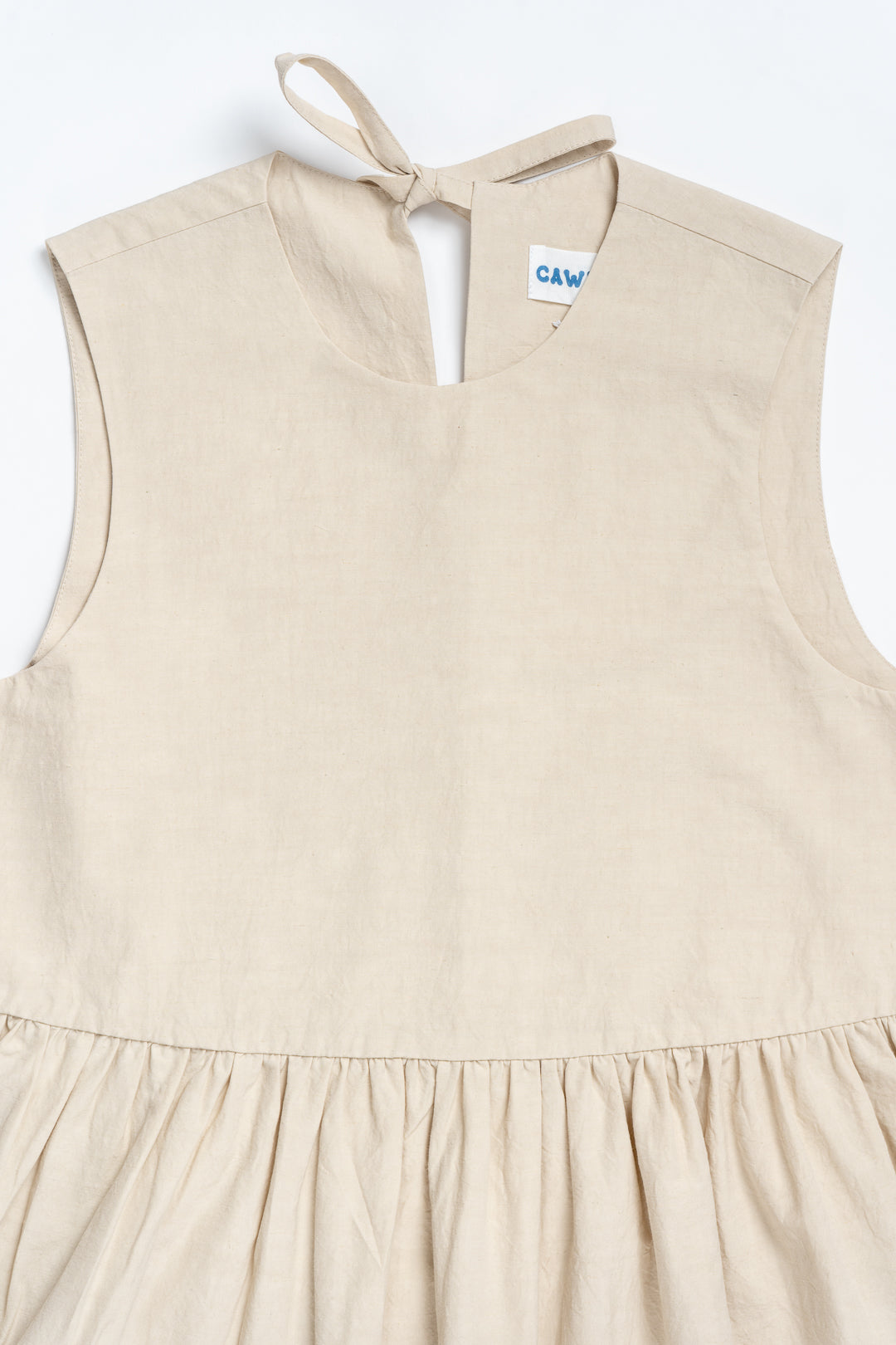 The Genevieve Dress is the perfect sleeveless, ankle length dress. A study in texture and movement, offering a soft yet structured feel. With sweet details including a tie neck fastening, frill hem, gathered waist and pockets.