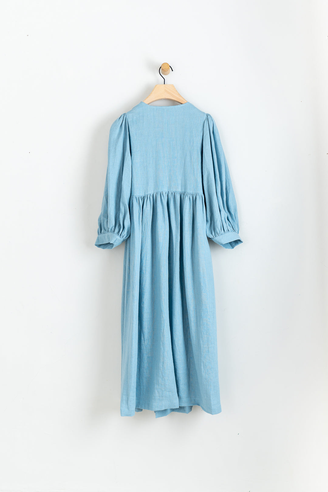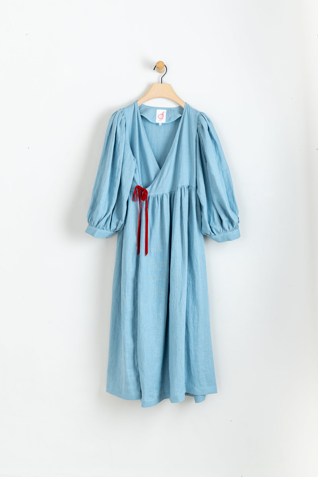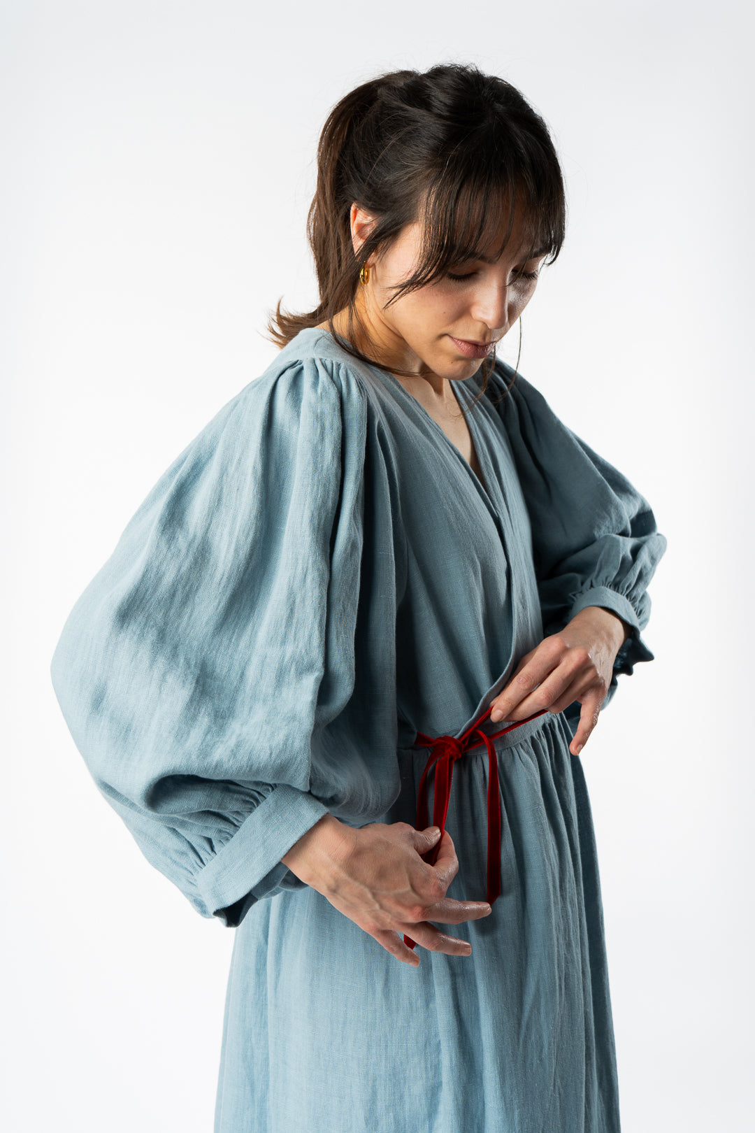 Hand made in Bristol from 100% European Linen, the Cloud 9 Dress is a generously gathered wrap dress with voluminous 3/4 length sleeves. Fastening with a contrasting velvet bow at the hip, with two concealed pockets and a full length skirt, the Cloud 9 Dress is glamorous and comfortable.