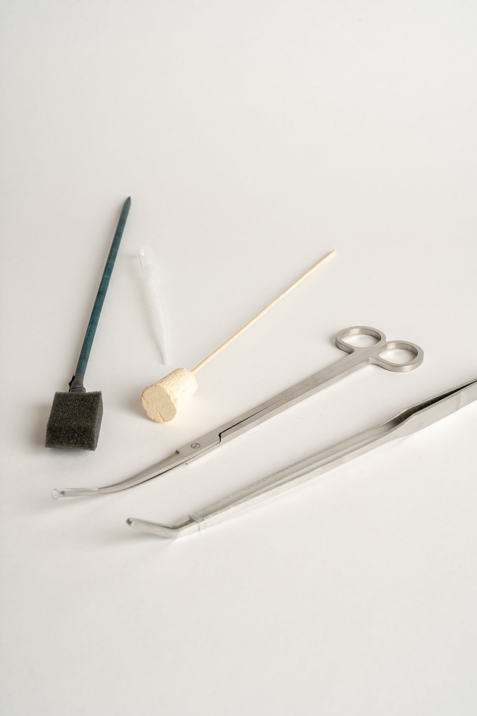 Set of 5 items: cork patter, sponge brush, curved scissors, terrarium tweezers and a pipette.