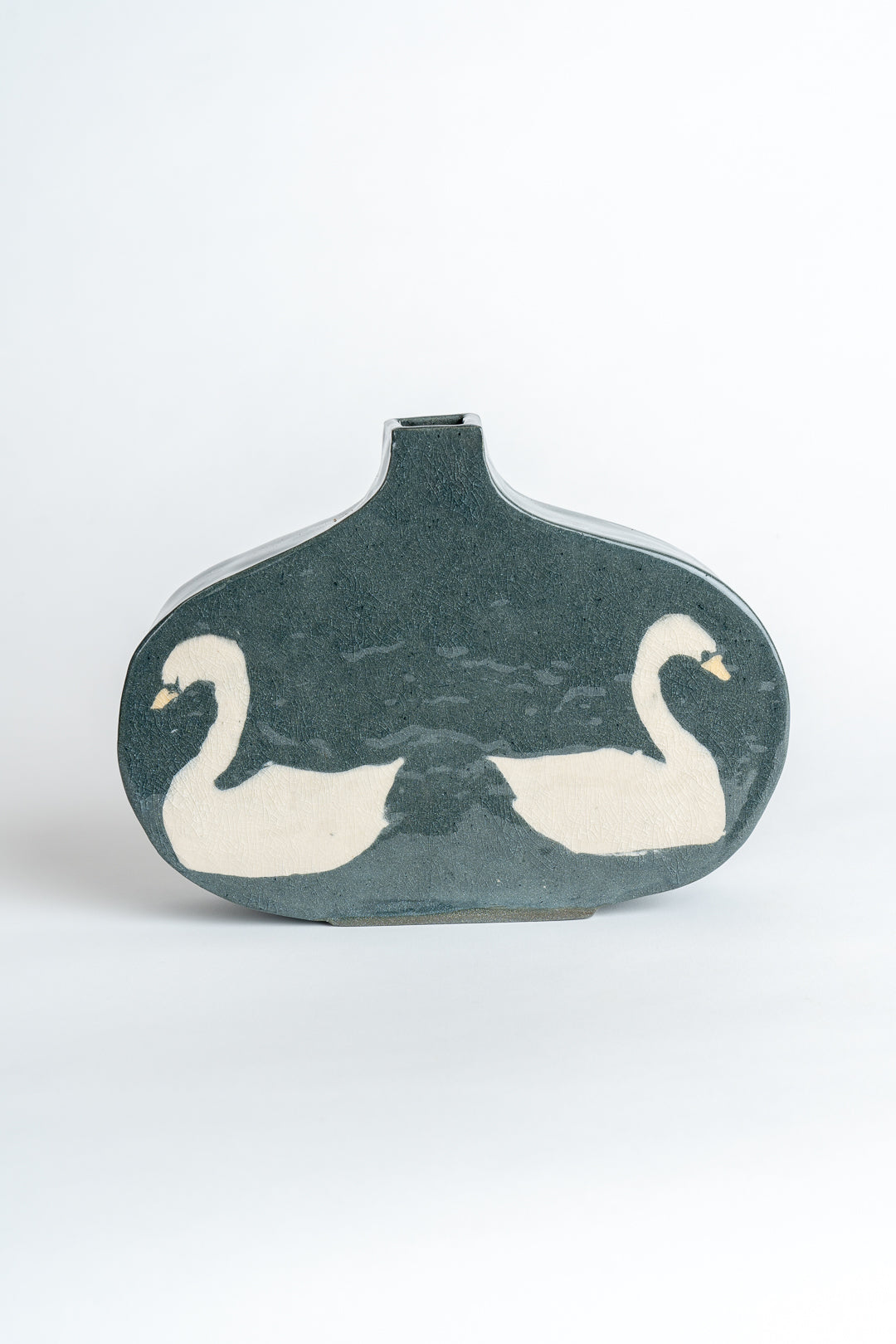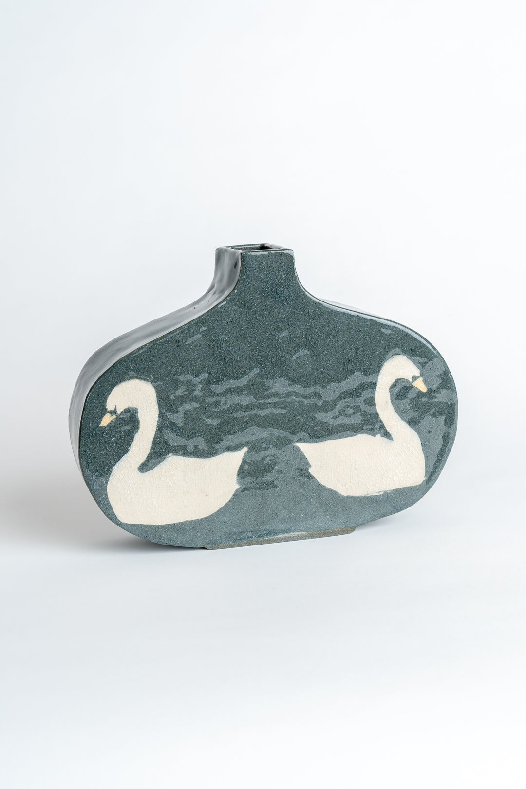 Made using a technique called 'nerikomi' - a process of stacking, cutting and rolling together pieces of clay to create patterns, the Swan Vase is made by hand in South London. The vase has a dark grey base and crackle gloss glaze finish. The pair of white Swans are delicately incorporated into the vase.